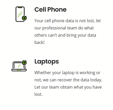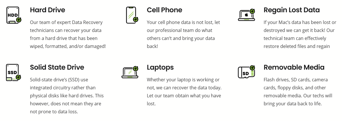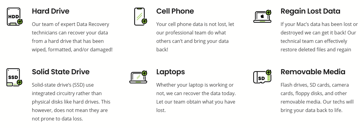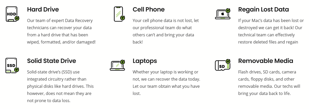 We have developed proprietary metrics and training to ensure our data recovery technicians are capable of retrieving the maximum amount of data in every recovery environment. Whether you have a laptop, computer, cell phone, flash drive or other storage device, we can and will get your lost data.