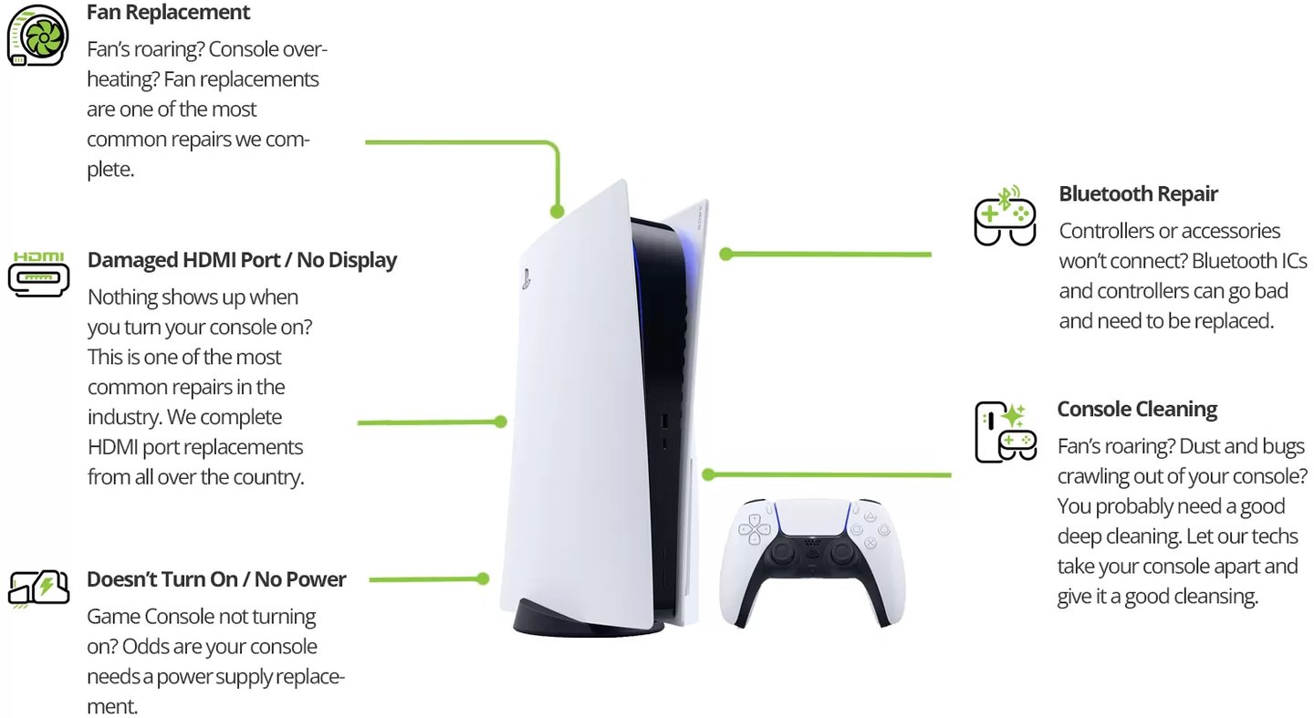 We fix all major brands of consoles; PlayStation, Xbox, Nintendo and more. Our technicians can pinpoint the problem with your device today at the best price points.
